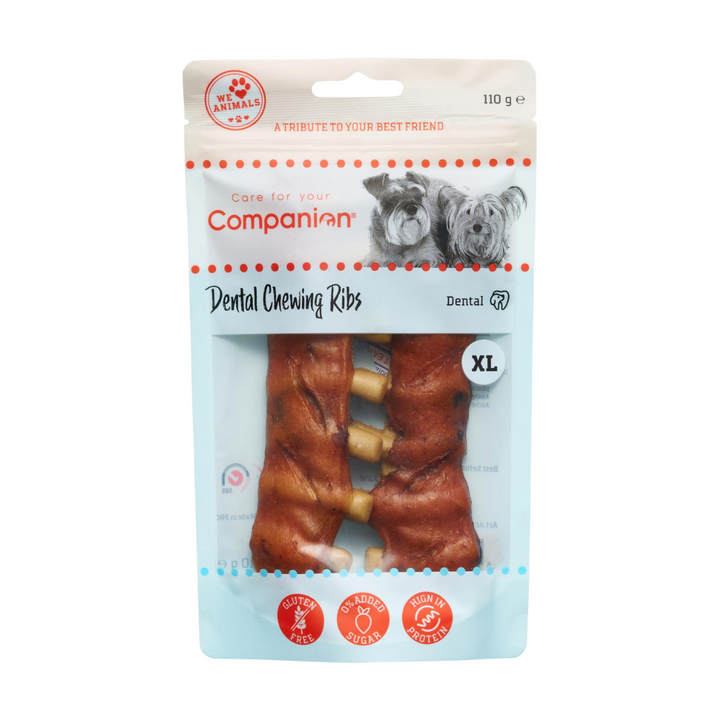 Companion Dental Chewing Ribs XL er en velsmagende snack, der kombinerer kyllingens protein med en rensende rillede tekstur. Naturlige ingredienser som sød kartoffel og ærtestivelse sikrer en sund tyggeoplevelse, mens calcium styrker tænder og knogler.