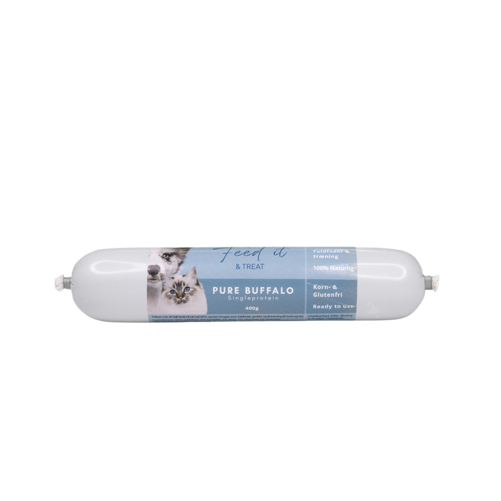 Feed’it & Treat Pure Buffalo er en smagfuld og blød pølse med højt indhold af bøffelkød, perfekt til kræsne eller sarte maver. Den er nem at skære, rig på næring og vitaminer, og passer til både hunde og katte i alle livsfaser.