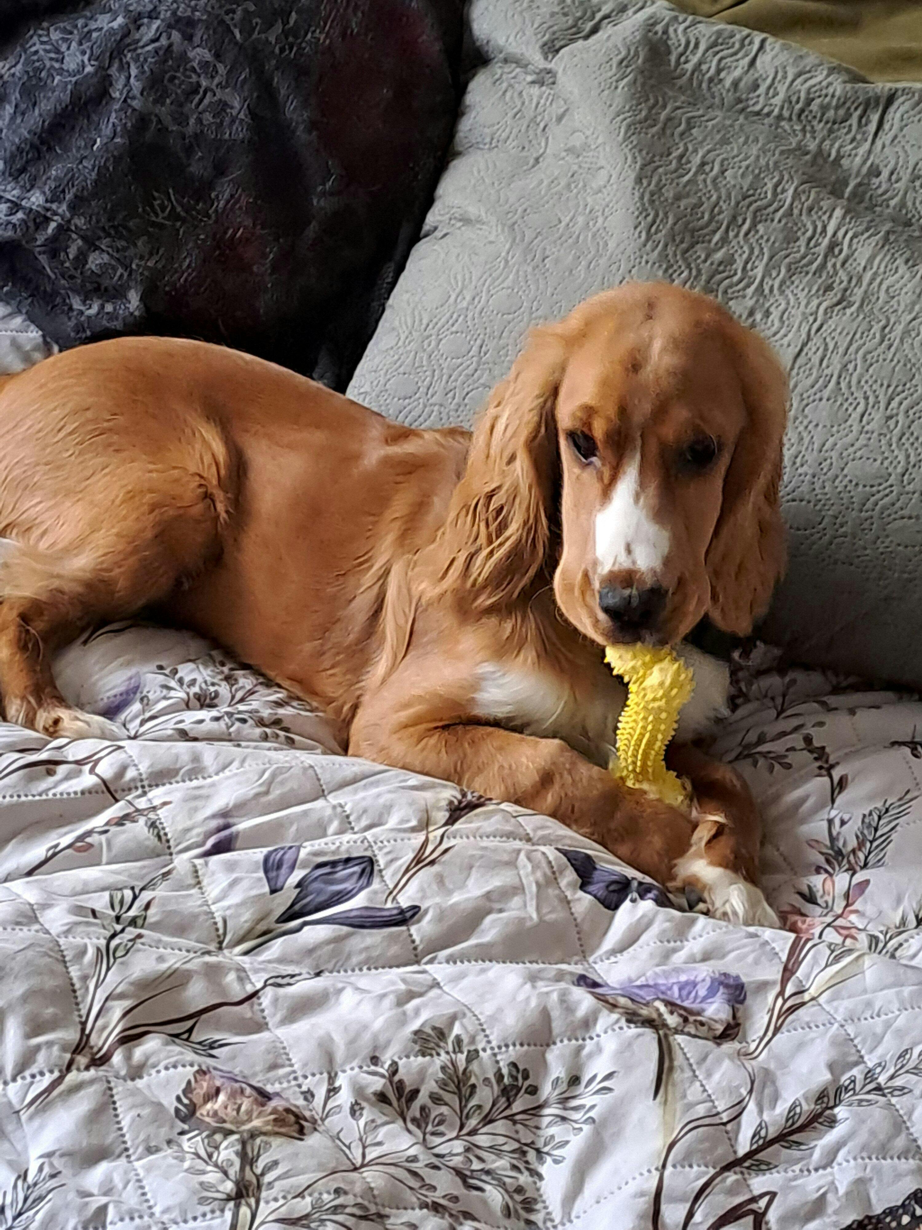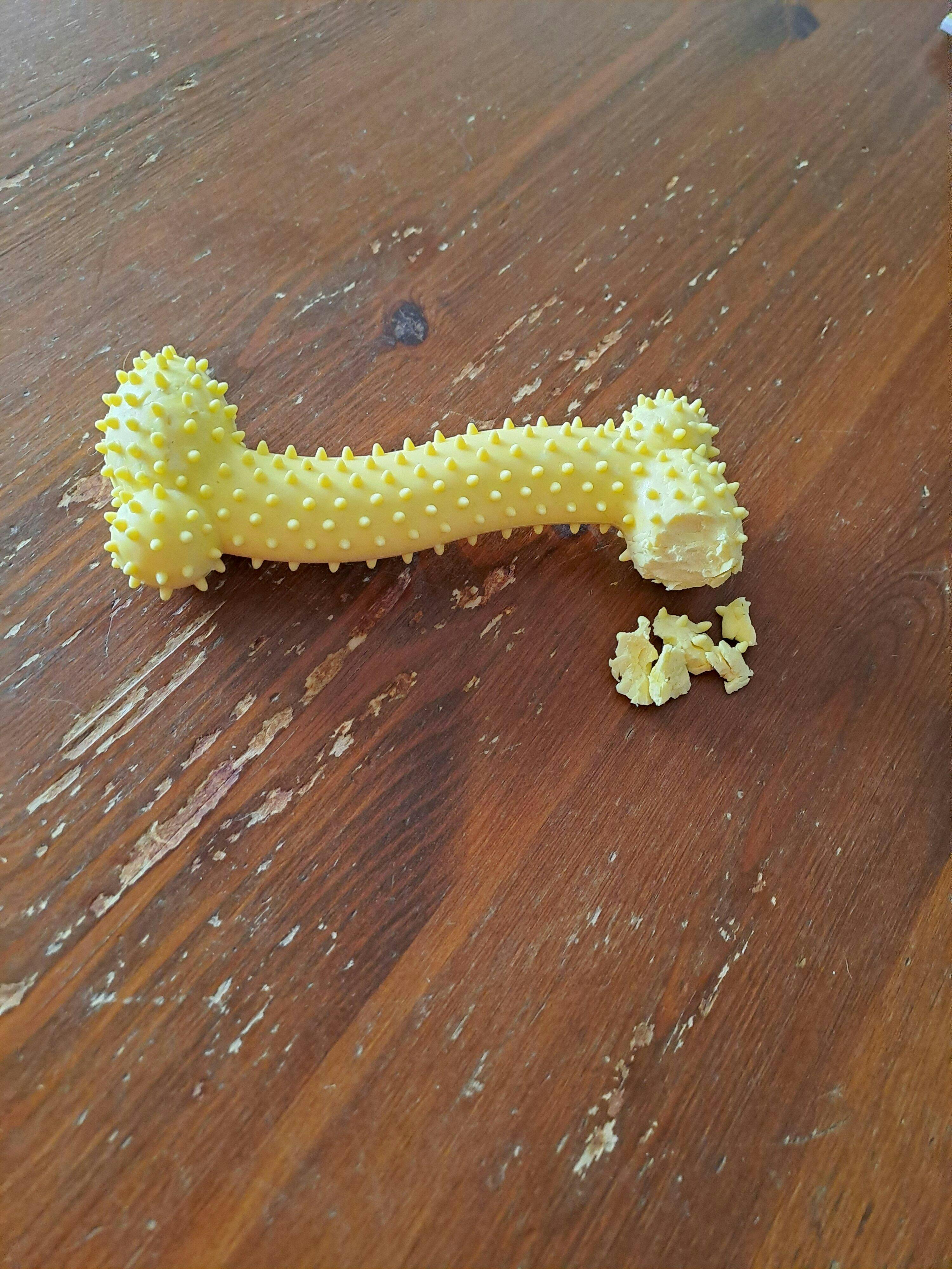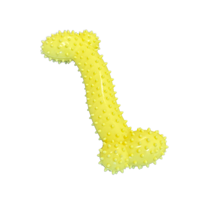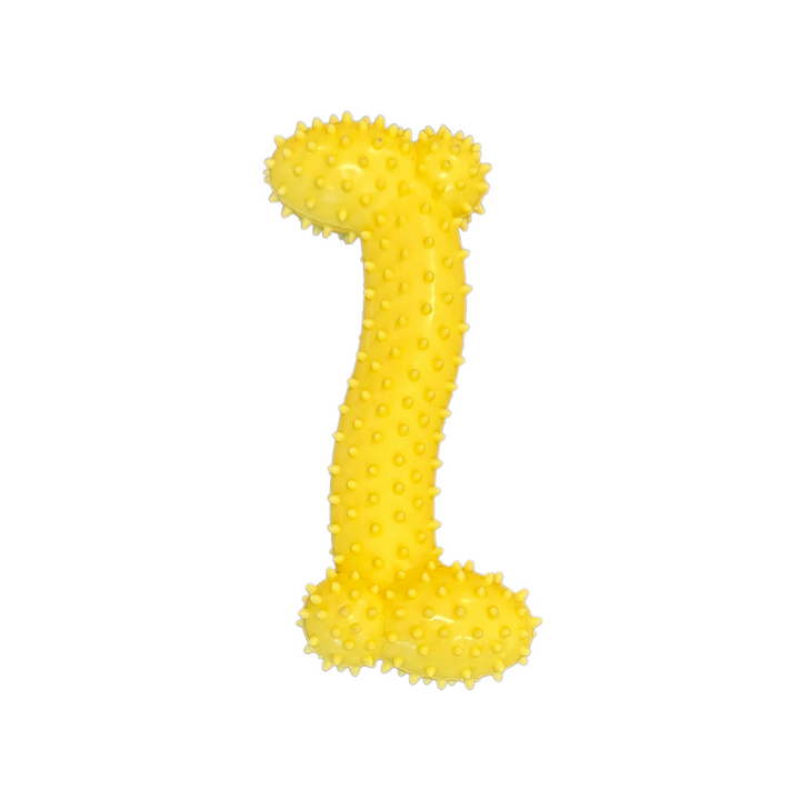 Dette gule gummi kødben med små dutter er designet til at tilbyde din hund timevis af sjov og stimulering. Dutterne masserer tandkødet og renser tænderne, mens den lyse farve øger synligheden og tiltrækker hunde i alle aldre. Legetøjet er ideelt til både apport- og tyggelege, hvilket hjælper med at reducere kedsomhed og angst.