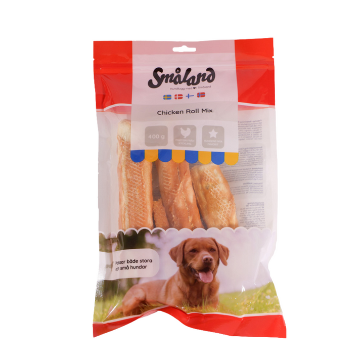 Småland Chicken Roll Mix er en smagfuld og holdbar tyggerulle med kylling, der tilfredsstiller tyggebehov og stimulerer din hund mentalt. Ideel som både belønning og daglig hygge for hunde, der elsker at gnave.